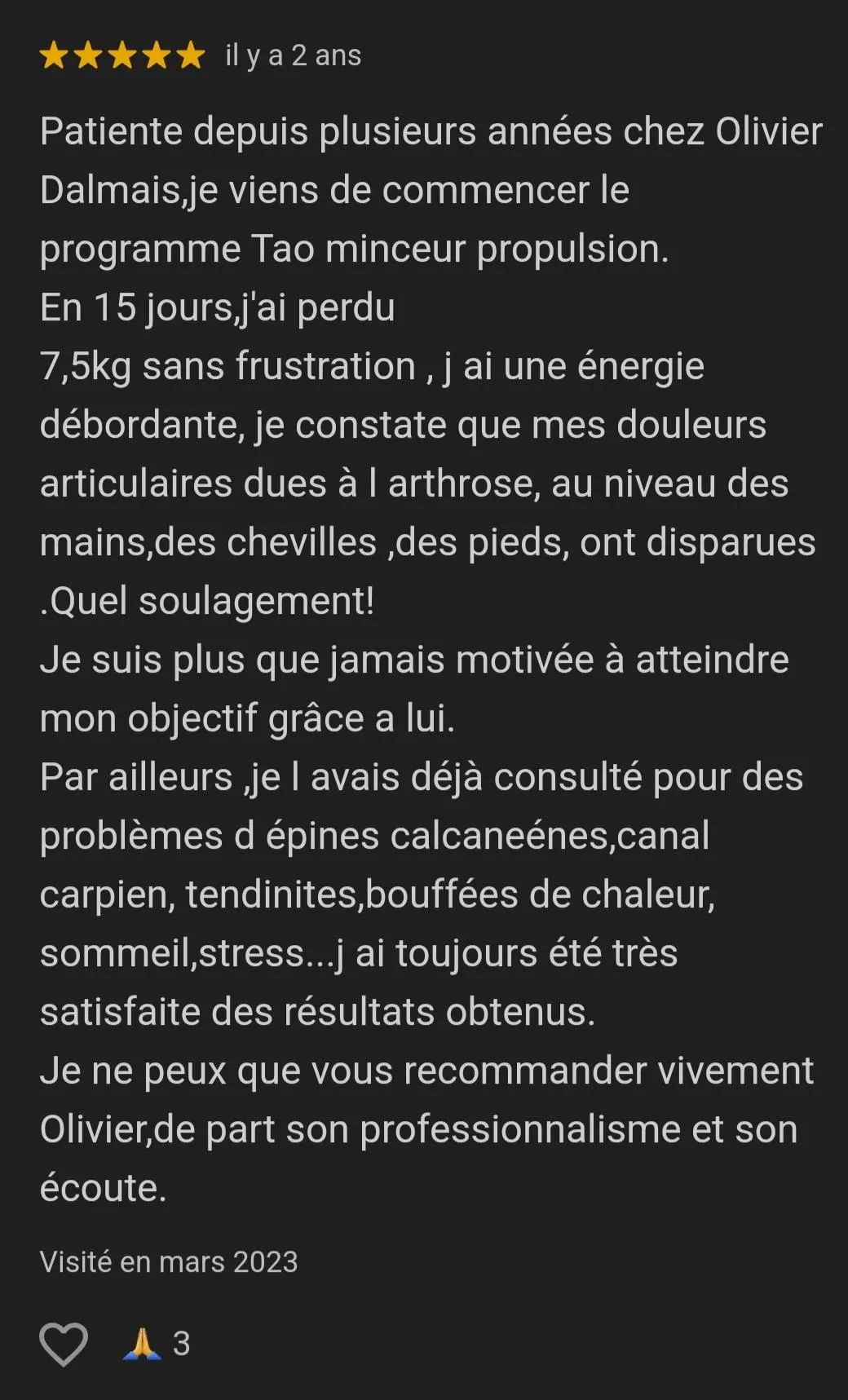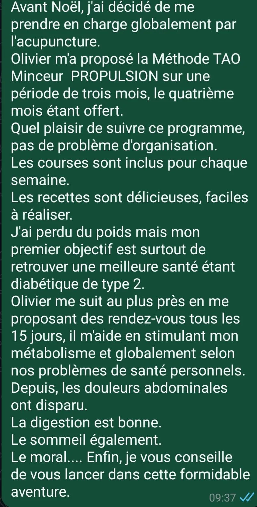 Bien souvent, la prise de poids, la graisse abdominale, les bouffées de chaleur, les migraines ou les douleurs articulaires ne sont pas de simples 3signe de l'âge", mais les signaux d'un déséquilibre plus profond, lié aux bouleversements hormonaux de la péri ménopause et de la ménopause. C'est cette réalité qui m'a conduit à créer le Programme TAO MINCEUR, fondé sur l'acupuncture et les principes de la médecine chinoise, une approche globale qui considère le corps, comme un tout cohérent, où le métabolisme, équilibre hormonal, énergie vitale et émotions sont intimement liés. En rétablissant cette harmonie, il devient possible de retrouver une silhouette plus légère, une énergie plus stable et un bien être durable.